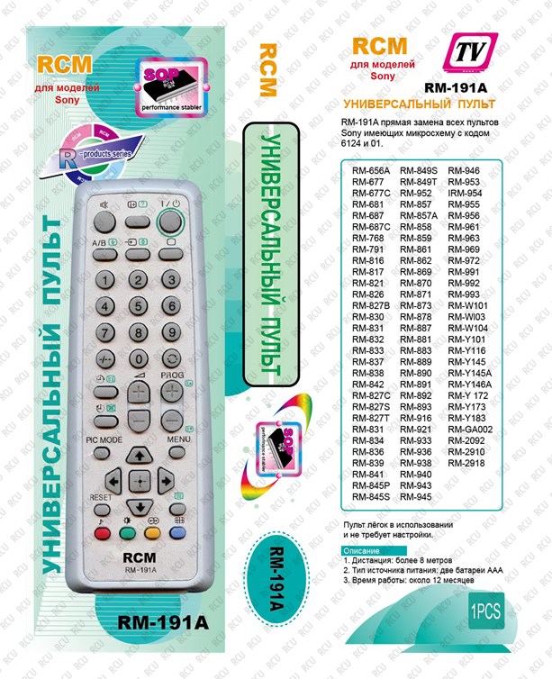 Пульт дистанционного управления Sony RM-191A. Цена от 87,00руб. за 50шт. до 150,00руб. за 1шт. Производитель RCM (Китай). Пульт является полнофункциональной копией оригинального пульта и полностью с ним совместим.